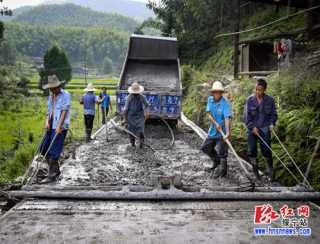 8月9日,瓦屋塘镇枫门岭村的村民正在忙碌着,该村一二组2公里长的组道硬化工程接近尾声。长期以来,由于交通不通,楠竹等农产品运不出,极大地影响了村民的经济发展。2015年,县财政局精准扶贫工作组进驻该村后,与村支两委一起多方筹资60多万元,村民自己投劳出力,共同完成这一民心工程。(刘玉松 刘建仁)