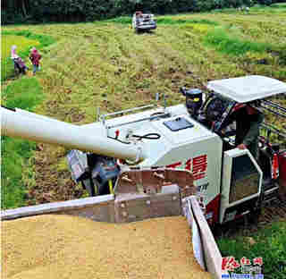 金秋时节,正是水稻丰收的时候。9月4日,武阳镇老百姓正热火朝天地收割水稻。村民用收割机从田里收割完稻谷,然后用车子拉回家里,晒完装袋,省时又省力。(杨亚林 李叶青)