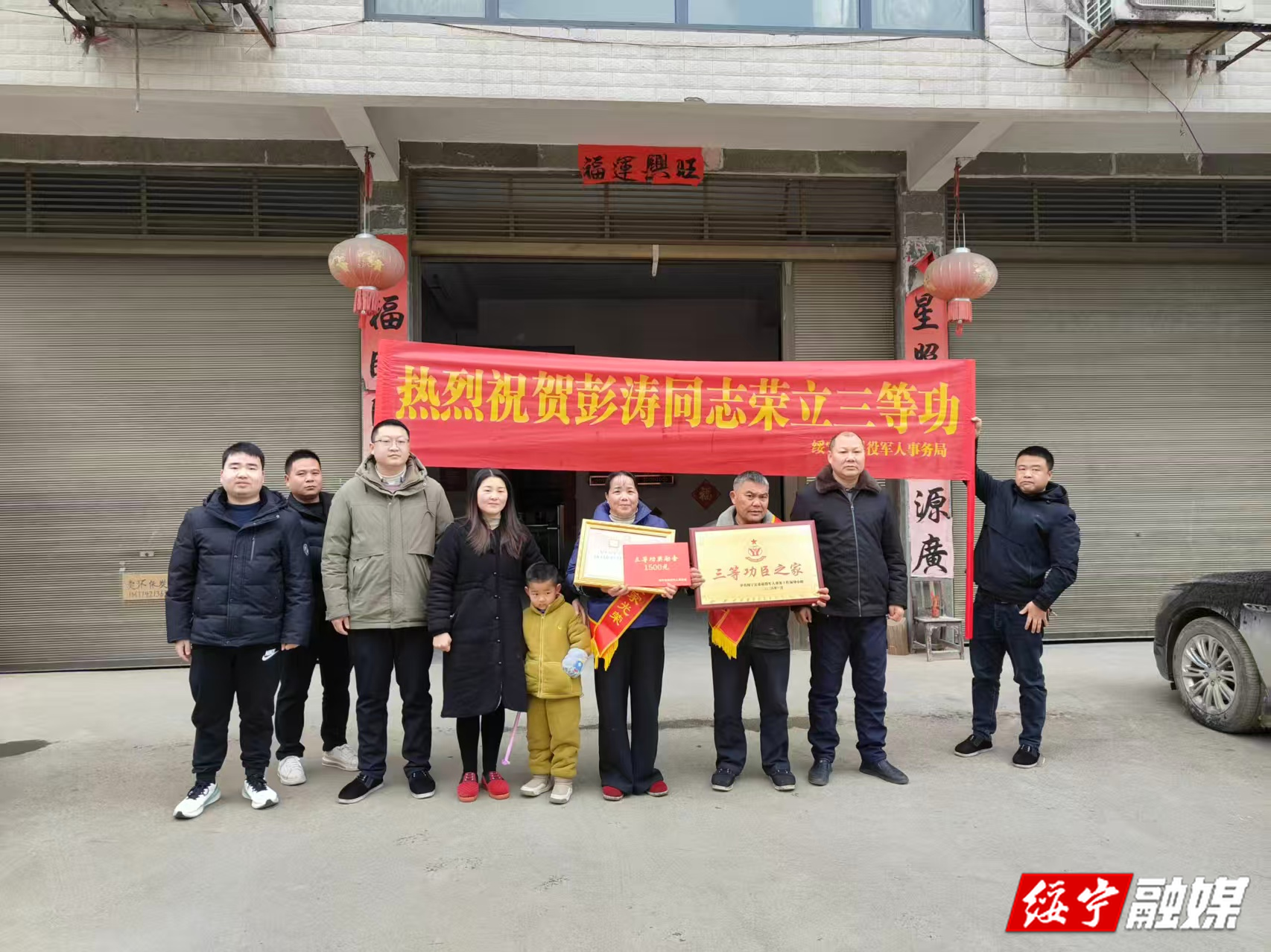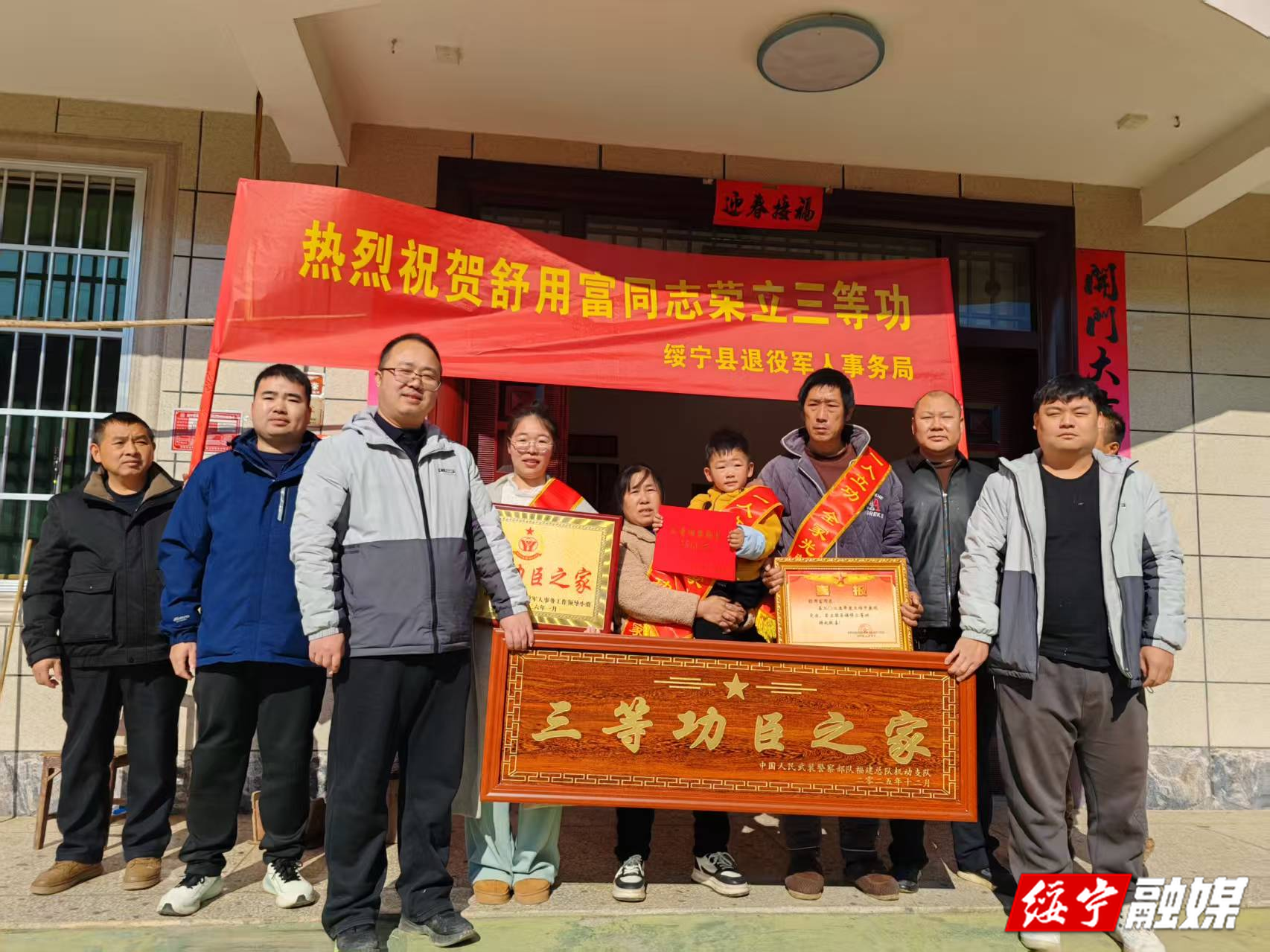 绥宁新闻网讯 (通讯员 莫平君)近日,绥宁县退役军人事务局联合乐安铺苗族侗族乡、瓦屋塘镇人民政府及村“两委”干部组成送喜报队伍,带着崇敬与祝福,专程前往荣立三等功的现役军人舒用富和彭涛家中,将烫金喜报、“功臣之家” 牌匾及奖励金郑重交到其家属手中,让军人荣誉 “看得见、摸得着”,让崇军尚武之风浸润乡村沃土。