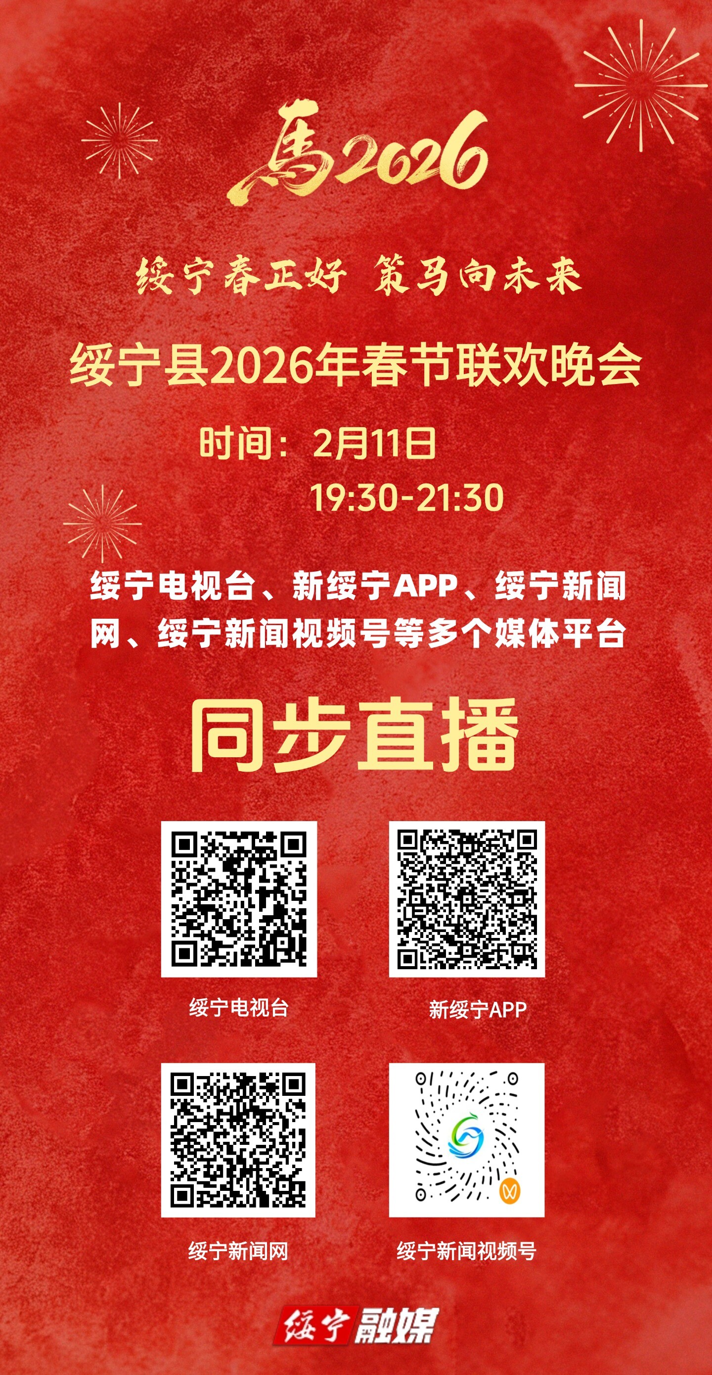 新绥宁APP —分享— 绥宁春正好 策马向未来绥宁县2026年春节联欢晚会2月11日(明天)19:30在绥宁县文化艺术中心正式举行!长按识别下图二维码即可在线收看精彩直播!↓↓↓ 来源:绥宁县融媒体中心 编辑:龙莉婷