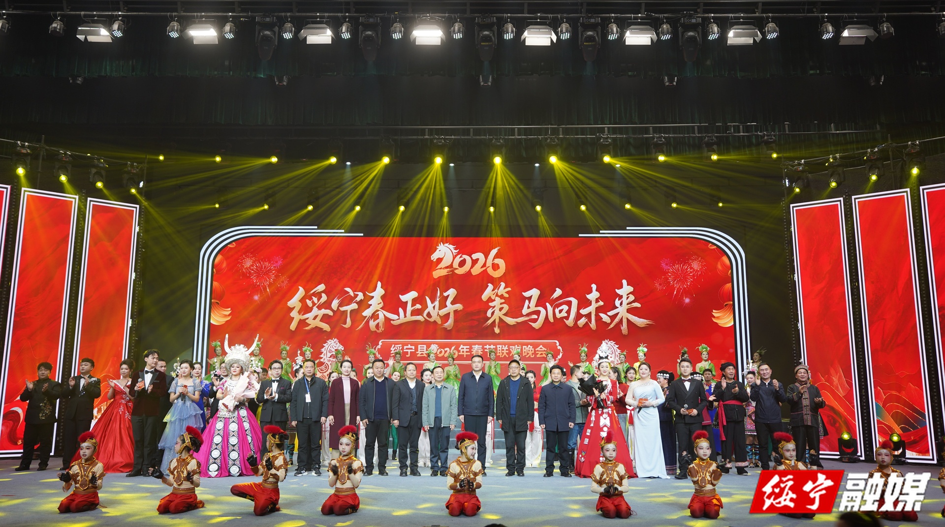 绥宁新闻网讯(记者 唐芳艳 唐远程)金蛇狂舞辞旧岁,骏马奔腾迎新春。2月11日19点30分,“绥宁春正好·策马向未来”绥宁县2026年春节联欢晚会在灯火璀璨、暖意融融的县文化艺术中心精彩上演,用一场“欢乐、祥和、精彩”的文化盛宴向全县人民致以马年春节的问候和美好的祝愿。县委书记吴军臣,县委副书记、县长夏贤钦,县人大常委会党组书记、主任石亮明,县政协党组书记、主席梁恩雄等县领导与全县各界干部群众欢聚一堂,共迎新春佳节。