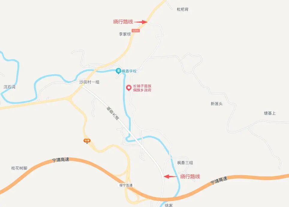 过往车辆在管制期间请绕行X170线长铺子乡人民政府路段(枫香村会子坳路口——兴隆街路口),如图所示。