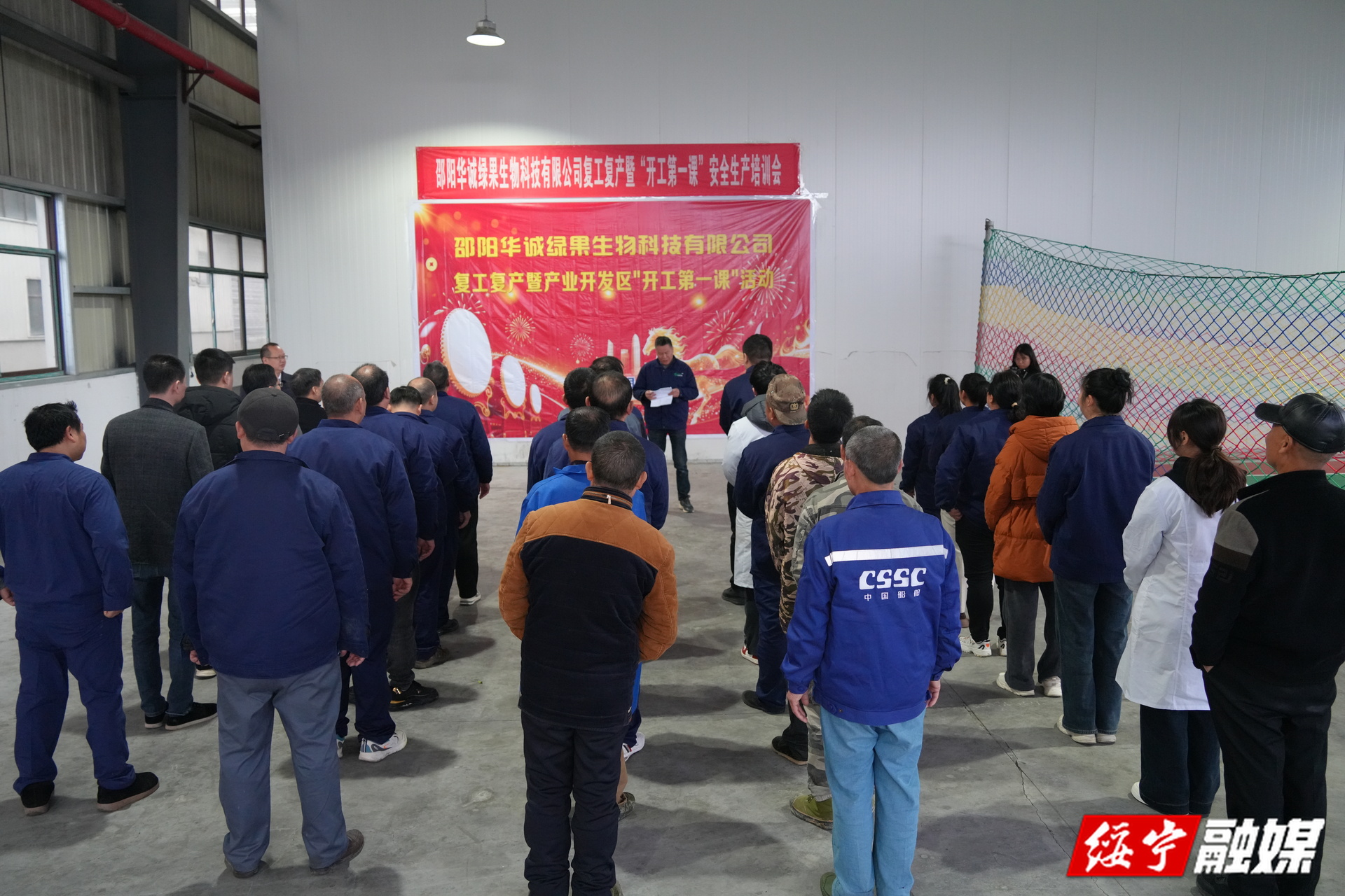 2月24日,新春年味仍浓,绥宁县工业园区各工业企业生产车间已是一派热火朝天的繁忙景象。邵阳华诚绿果生物科技有限公司率先全面复工复产,60余名员工到岗到位,集中开展复工复产暨产业开发区“安全生产开工第一课”活动,从“过年模式”快速转入“生产模式”,马不停蹄赶订单、开足马力扩产能,以昂扬奋进姿态冲刺新春“开门红”。