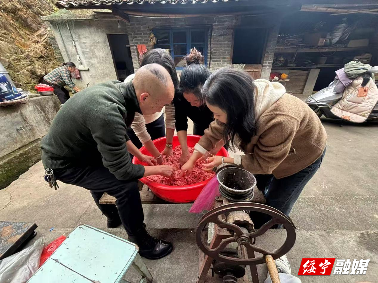 “咱们一起动手,年味才足!”农家小院里,欢声笑语不断。党员干部和村民围站在一起,揉拌馅料,制作猪血丸子特色年货,鲜红的馅料在手中反复揉捏,每一道工序都包裹着对新春的期盼与祝福,浓郁的年味扑面而来。“以前都是自家忙年,今年有干部们一起帮忙,更热闹了。”居民杨小青说道,脸上洋溢着幸福的笑容。热气腾腾的猪血丸子一成型,便被第一时间送往村里的独居老人和困难家庭中,覆盖50余户。党员干部们还细心地帮着挂春联、贴福字,随后与老人们围坐分享。食物鲜香之中浸润着团圆的温馨,欢声笑语里浸润着浓浓的邻里情。党群同心、携手迎新,一双双忙碌的手,传递的不仅是温暖,更是紧紧连在一起的心。党员干部的到来,不仅让传统年俗增添新趣,更让新春的暖意流入每家每户,在升腾的烟火气中,绽放出属于新春的团圆美好。