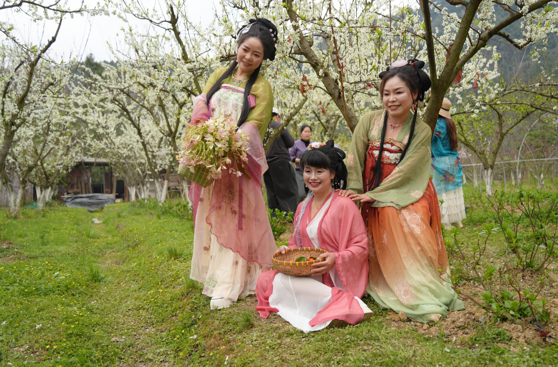 微风轻拂,花瓣随风摇曳,淡淡清香沁人心脾,勾勒出一派醉人的春日田园风光,吸引众多游客前来踏青赏花、打卡游玩。游客们徜徉花海间,或驻足观赏、细嗅花香,或举机拍照、定格春光,欢声笑语在花园里久久回荡。其中身着汉服的游人漫步花间,与洁白李花相映成趣,古风雅韵与现代气息交融碰撞,上演一场穿越古今的春日邂逅。