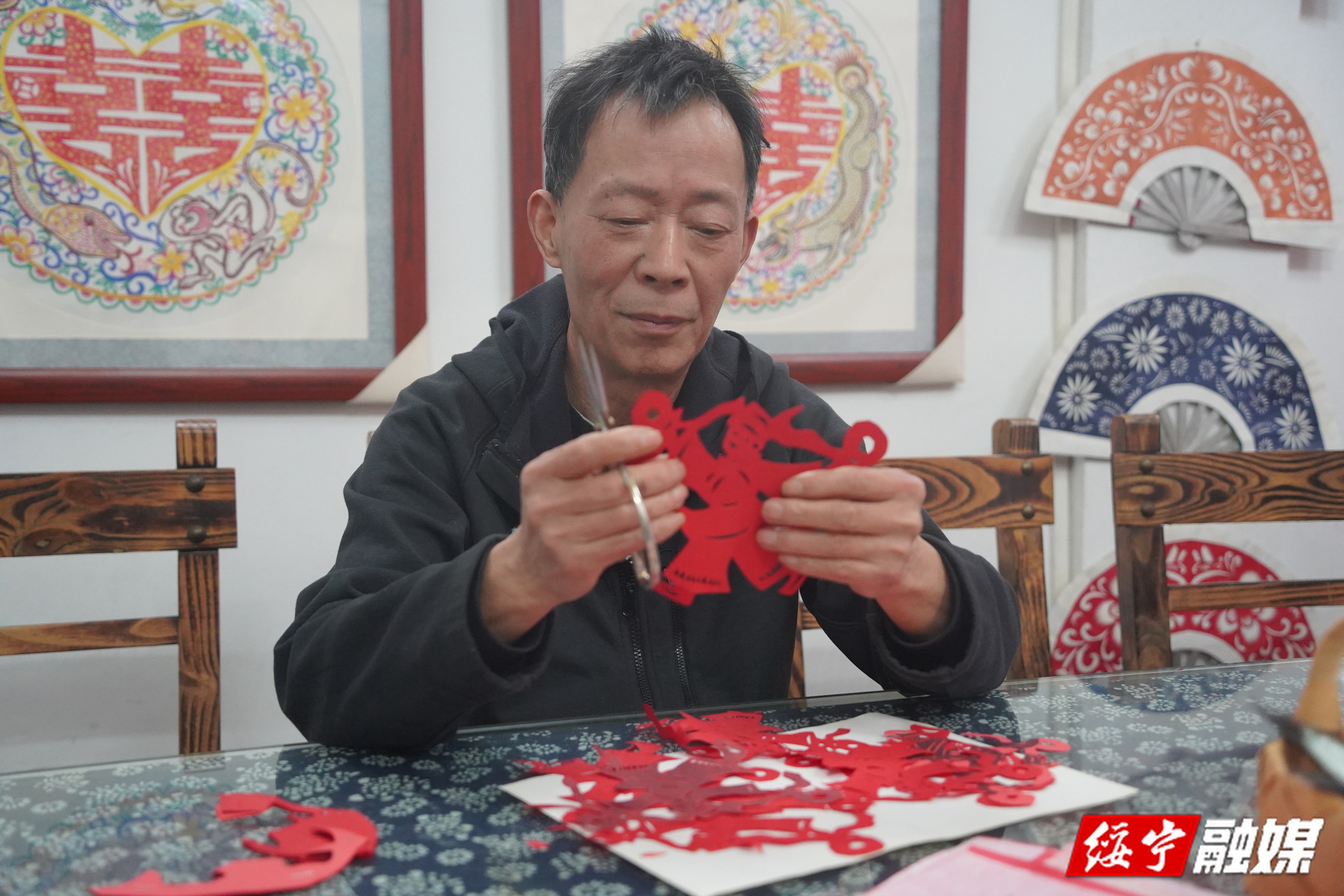今年66岁的唐东风,自10岁起便学习剪纸,至今已与剪刀相伴56年。他的作品以“生活即艺术”为理念,擅长将苗族农耕、节庆、婚俗等场景融入创作,代表作《巫水情》曾耗时一年完成,被制成200米浮雕艺术墙,成为了县城地标。多年来,他深耕本土文化、探索非遗活态传承,这次剪纸艺术文创扑克牌的诞生,正是他的一次新尝试。