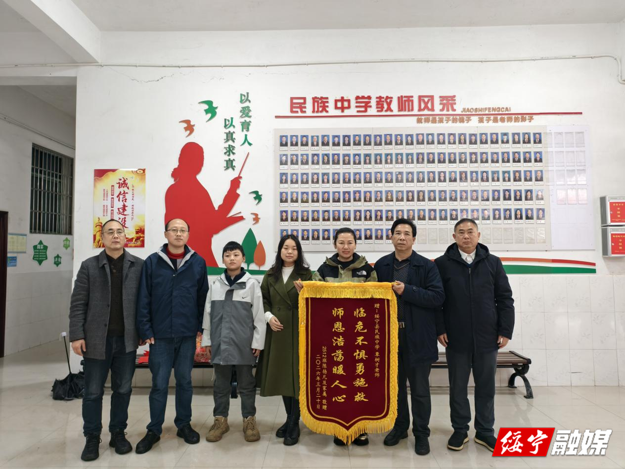 绥宁新闻网讯(通讯员 李晴 陈树文 杨斌)3月27日,绥宁县民族中学内暖意融融,2512班学生小陈的妈妈怀着无比激动的心情,专程赶到学校,将一面印有“临危不惧勇施救,施恩浩荡暖人心”的锦旗郑重送到覃树才老师手中,紧紧握住覃老师的手反复表达谢意,真挚的话语里满是感激之情,也让在场的师生深受触动。