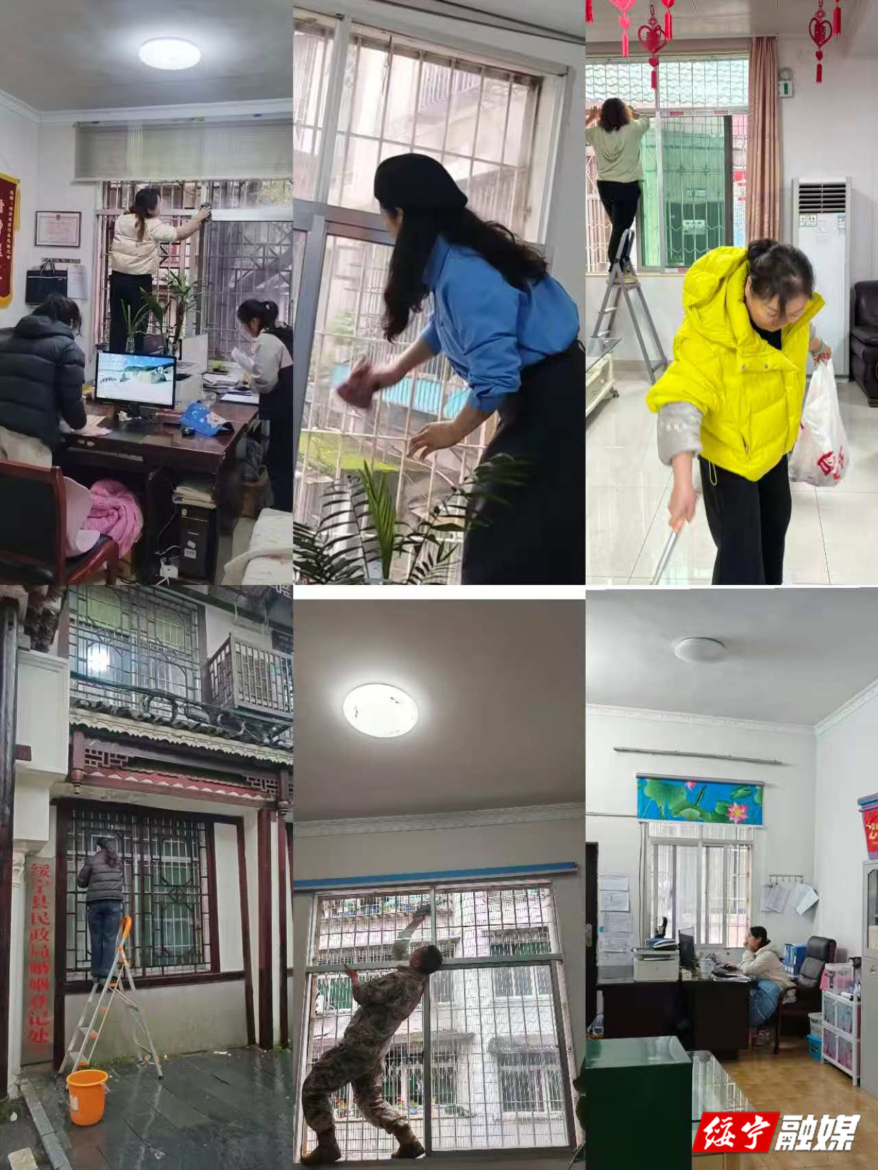 行动中,全体干部职工分工协作、协同发力。大家手持抹布、拖把、扫帚、水桶等工具,分区包干、有序推进。在办公室区域,逐一擦拭桌面、电脑、打印机等办公设备,细心清理键盘缝隙中的积尘,规整文件资料,统一摆放标准;在楼道走廊和会议室,反复拖洗地面,用湿布擦拭踢脚线、扶手和窗台,连墙角蛛网、窗槽积灰也不放过。同步规范办公物品摆放,清理各类杂物垃圾,更新公益宣传展板,完善禁烟标识与文明提示牌,并对门窗墙面、消防设施、公共设施进行细致擦拭与维护,确保窗明几净、摆放有序、环境优美、氛围浓厚。