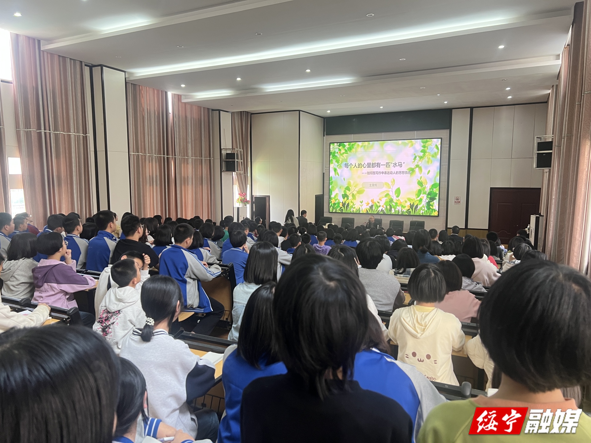 绥宁新闻网讯(通讯员 阳洁)4月17日下午,绥宁县实验中学报告厅内书香氤氲。由绥宁县文学艺术界联合会指导、绥宁县作家协会主办,绥宁县实验中学与绥宁县新华书店联合协办的“与作家对话,与文学同行”写作专题讲座如期开讲。本次活动特邀中国作家协会会员、绥宁本土实力派作家龙章辉老师带来题为《每个人的心里都有一匹“水马”——如何在写作中表达动人的思想情感》的文学分享,为全校数百名师生献上一场干货满满的文学盛宴。