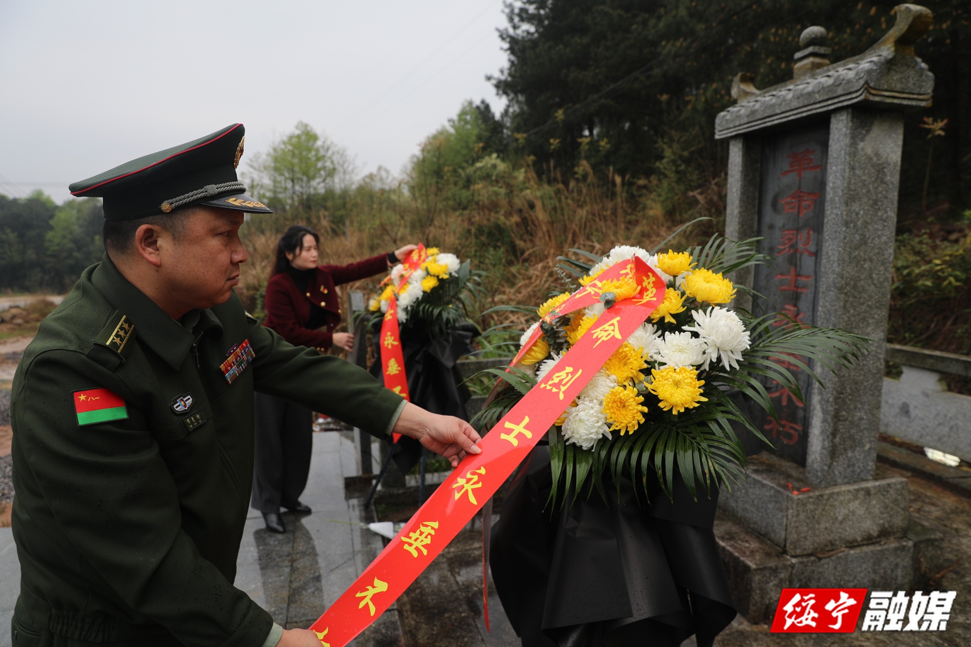上午9时,祭扫活动正式开始,两名民兵迈着铿锵有力的步伐敬献花篮,县人武部政委邓先柯神情庄重地仔细整理花篮和绶带,全体人员肃立默哀三分钟,深切缅怀先烈。默哀毕,邓先柯现场为大家讲述了匡非非烈士的英雄事迹,并饱含深情地宣读了《致匡非非烈士的一封信》。随后,全体人员依次敬献菊花和深深鞠躬,并拿起扫帚、抹布等工具,仔细清扫烈士墓周围的落叶、尘土,擦拭墓碑和基座。