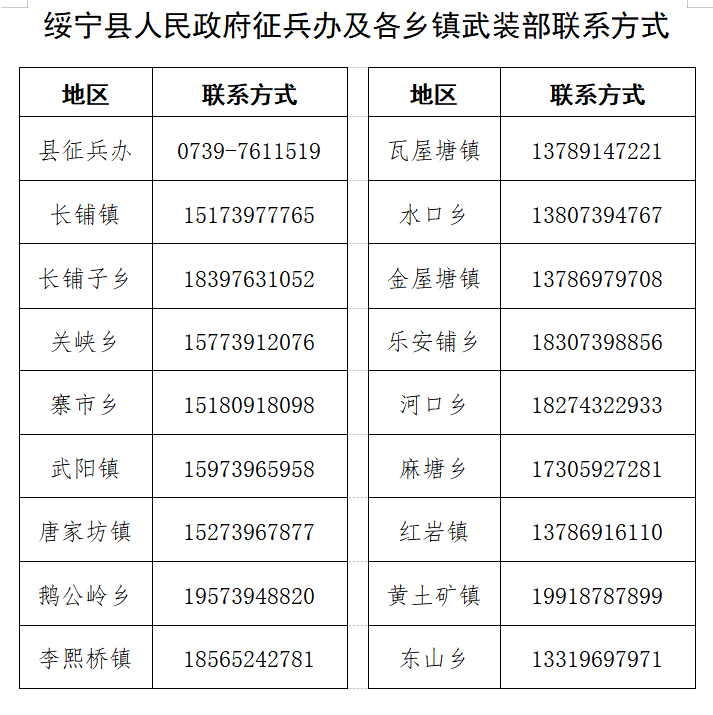 依法服兵役和进行兵役登记是法律赋予每个适龄男性公民应尽的光荣义务和神圣责任,适龄青年应自觉按时进行兵役登记或核验。为全面做好湖南省绥宁县2026年度兵役登记和征兵工作,根据《中华人民共和国兵役法》和《征兵工作条例》相关规定,现将我县2026年度兵役登记和上半年征兵应征报名有关事项公告如下: